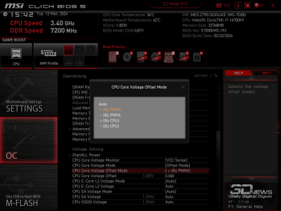 К сожалению, ко мне прямиком из Китая приехала не самая удачная версия Core i7-14700KF — чип плохо поддается ручной настройке. Разгонять его нет никакого смысла — для этой процедуры неплохо бы обзавестись кастомной СЖО с парой толстых радиаторов. А вот снизить общее энергопотребление такого кристалла — то, что доктор прописал. Плюс прошивка MEG Z790 GODLIKE обладает всем необходимым инструментарием. На практике же стабильная работа Core i7-14700KF была обеспечена в режиме Offset -0,065 Вт при автоматическом регулировании противодействия падению напряжения под нагрузкой — в ваттах экономия энергии составила всего 15-20 единиц. Несерьезный показатель. Рядом с Core i7-14700KF лежит Core i9-12900K, который без падения производительности легко «худеет» на 50-60 Вт при должной настройке VCore.