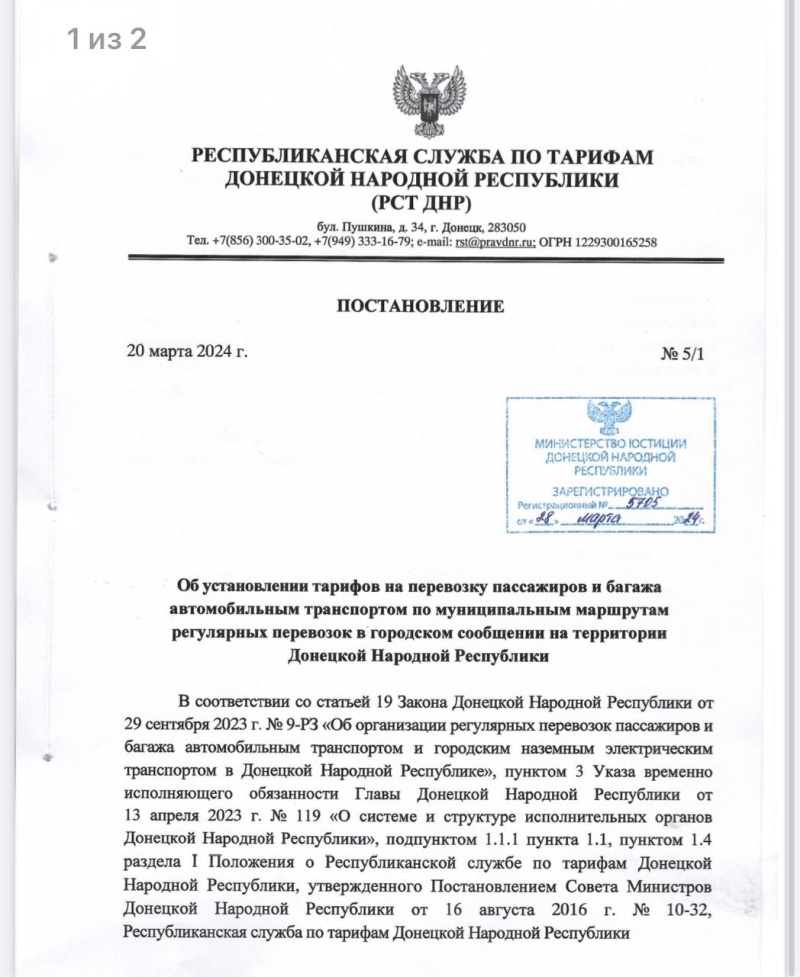Республиканская служба по тарифам Донецкой Народной Республики опубликовала постановление, что с 1 мая 2024 года подорожает проезд в общественном транспорте.