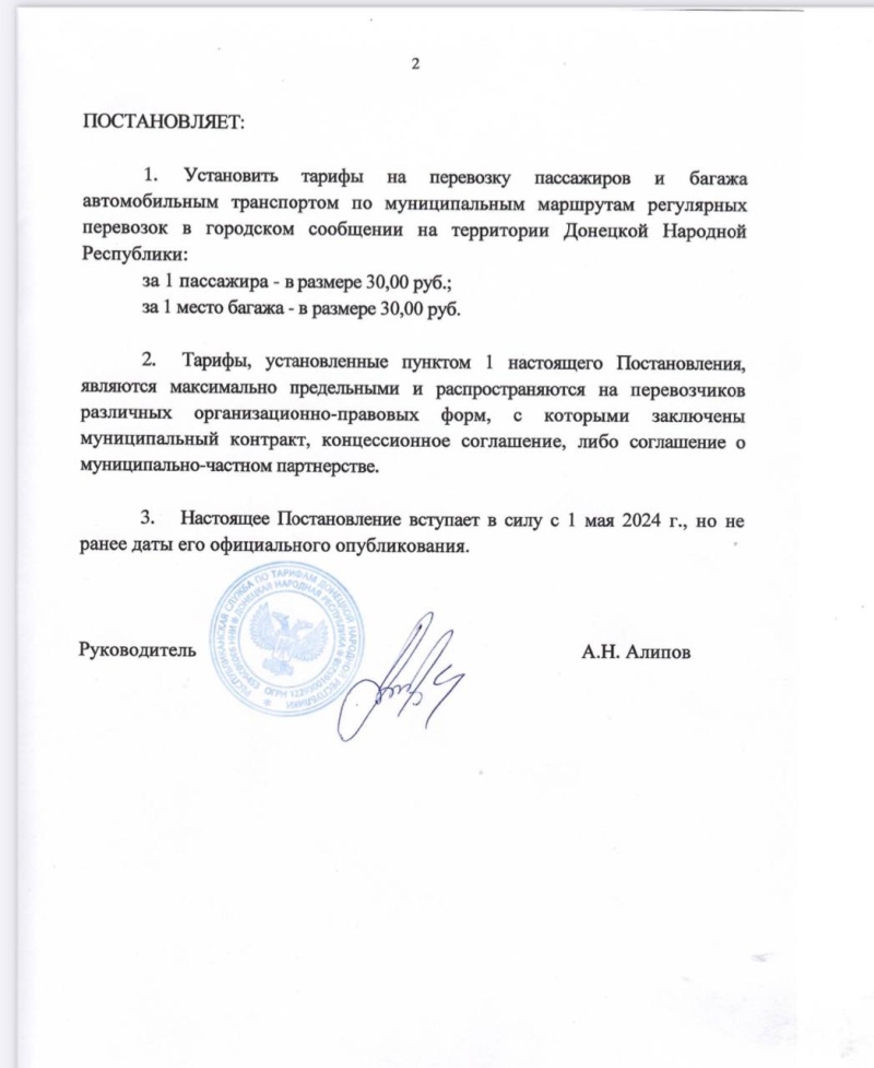 «Установить тарифы на перевозку пассажиров и багажа автомобильным транспортом по муниципальным маршрутам регулярных перевозок в городском сообщении на территории ДНР: за одного пассажира — в размере 30 рублей; за одно место багажа — в размере 30 рублей», — сказано в постановлении.