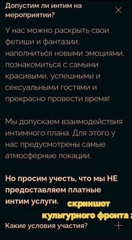 «Сатана шагает по Москве. Не успели улечься возмущения адским шоу на Лубянке (кстати, никакой реакции сверху пока нет, шоу преспокойно работает), как нам стало известно от читателей о готовящемся 27-го апреля ещё более вызывающем мероприятии. Называется оно просто и без затей INFERNO, что в основных европейских и ближневосточных языках означает АД. Цены от 25 000 до 595 000 рублей. Пишут, что сексуальных услуг за деньги не предоставляют, но... см. скриншот», — сообщили авторы телеграм-канала «Культурный фронт Z».