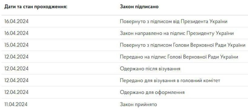 «Возвращен с подписью от президента Украины», — говорится в карточке документа на сайте парламента.