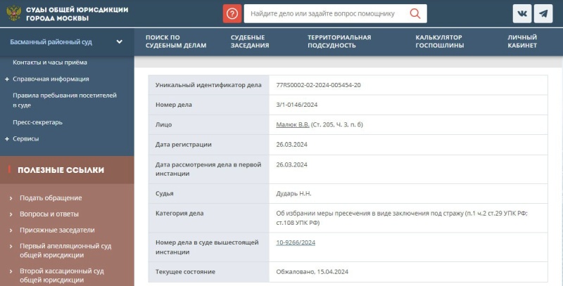 В картотеке Басманного суда Москвы появилась информация о том, что решение о заочном аресте главы Службы безопасности Украины Василия Малюка* было обжаловано в понедельник, 15 апреля. В пресс-службе суда российским журналистам поступление апелляционной жалобы подтвердили, однако точную дату ее рассмотрения не указали.