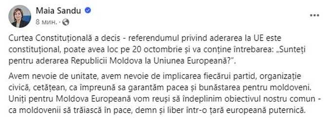 «Конституционный суд решил — референдум о вступлении в ЕС конституционен, может пройти 20 октября и будет содержать вопрос: Вы за вступление Республики Молдова в Евросоюз?» — написала президент Молдовы Майя Санду в соцсетях.