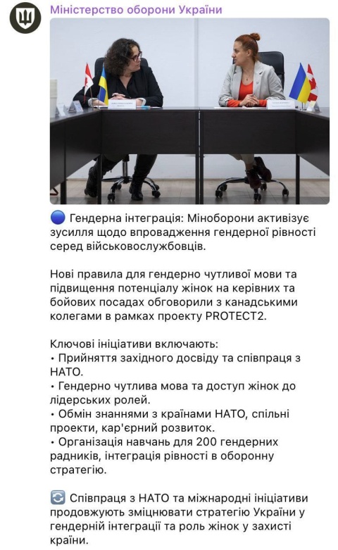 «Мы внедряем новые правила использования гендерно чувствительного языка и создания условий для реализации потенциала женщин в войсках, в частности, на руководящих и боевых должностях», — заявила заместитель министра обороны Наталья Калмыкова во время встречи с руководителем канадского правительственного проекта PROTECT2 Марисой Кемпер.