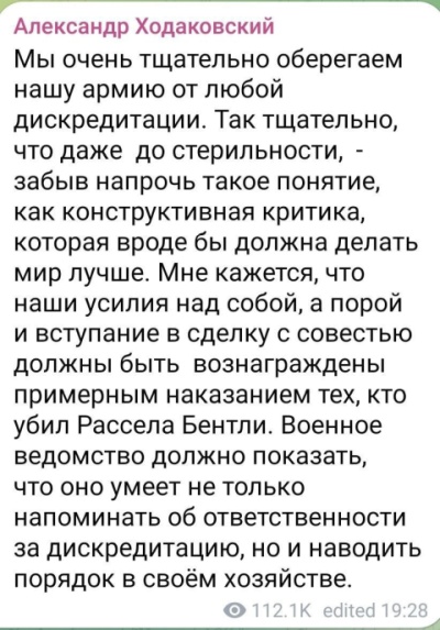 «Мы очень тщательно оберегаем нашу армию от любой дискредитации. Так тщательно, что даже до стерильности, - забыв напрочь такое понятие, как конструктивная критика, которая вроде бы должна делать мир лучше. Мне кажется, что наши усилия над собой, а порой и вступание в сделку с совестью должны быть вознаграждены примерным наказанием тех, кто убил Рассела Бентли. Военное ведомство должно показать, что оно умеет не только напоминать об ответственности за дискредитацию, но и наводить порядок в своём хозяйстве», - призвал на своей странице в социальной сети основатель батальона «Восток» (именно в этом подразделении воевал Рассел Бентли), ныне замглавы Росгвардии по ДНР Александр Ходаковский.