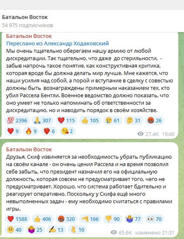 Сегодня стало известно о том, почему основатель батальона «Восток», в котором воевал Рассел Бентли, Александр Ходаковский, удалил свой пост с призывом к военному ведомству разобраться в ситуации. «Антифашист» писал об этом вчера – как раз во время написания текста, где цитировался пост Ходаковского, он неожиданно исчез. О том, что произошло, сообщил батальон «Восток».