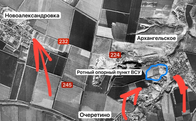Ряд военных телеграм-каналов сообщает, что штурмовые отряды ВС РФ подошли вплотную к н.п. Новоалександровка и практически отбили у противника большую часть н.п. Архангельское, атаковав с юга. Сейчас идет штурм опорного пункта ВСУ на западной окраине села. Основная высота «точка 245» под нашим контролем. Остальные высоты и опорники на них сейчас под штурмом. С их взятием, оборона противника на этом направлении рухнет. Откроется дорога на н.п. Калиново, а южнее на н.п. Сокол.