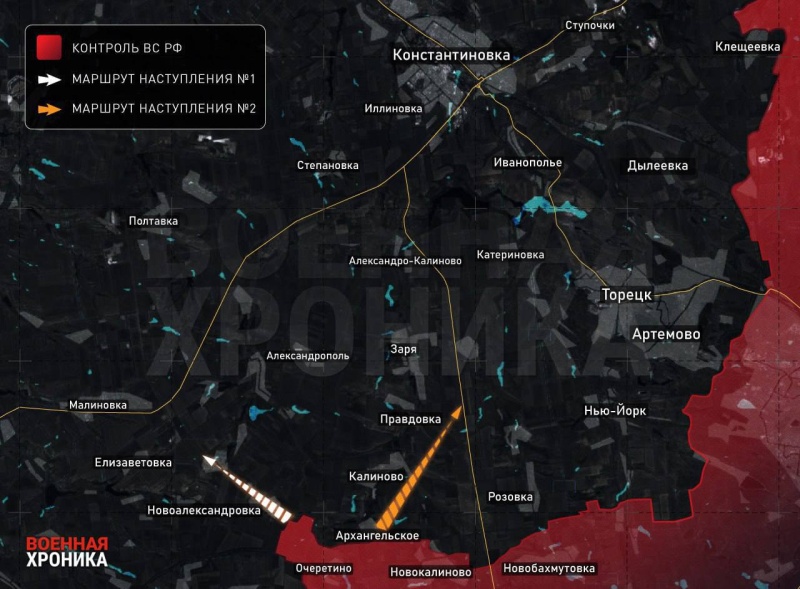 «Помимо того, что постепенно утрачивается возможность обстреливать Донецк (что долгие годы было важно для Киева с психологической точки зрения), есть и сугубо военные, тактические опасности. Во-первых, сейчас российские войска вплотную подошли к Новоалександровке. Меньше, чем через 10 км, от этого места находится ключевая развязка трассы Т-0504 между Покровском и Константиновкой. Во-вторых, чуть больше 12 км от текущей позиции российских войск остаётся до трассы Н-20 на ту же Константиновку. Иначе говоря, вариантов для наступления как минимум два (третий — это продолжать двигаться на запад от Очеретина вдоль железной дороги), и помешать командованию российской армии выбирать между ними украинские войска пока не могут», — комментирует «Военная хроника».