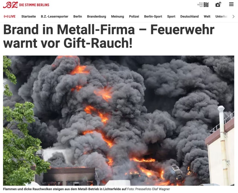 Днём 3 мая вспыхнул пожар на металлургическом заводе оборонно-промышленной компании Diehl в Берлине, на котором, в числе прочего, производятся системы противовоздушной обороны Iris-T, в том числе, и для Украины.