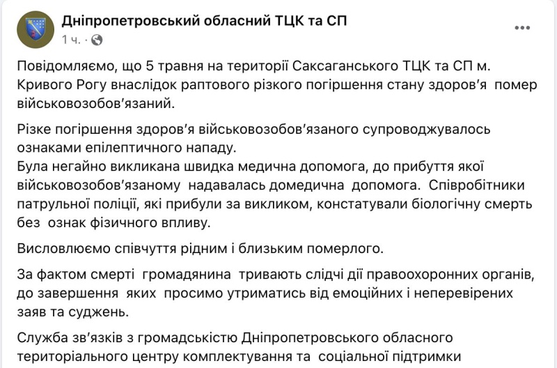 Такой официальный комментарий дал ТЦК Кривого Рога о смерти мужчины на их территории.