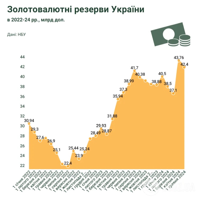 Национальный банк Украины сообщил о снижении золотовалютных резервов (ЗВР) из-за сокращения международной помощи. В апреле 2024 года их общий размер сократился на 3,1%, и достиг $42,4 млрд.