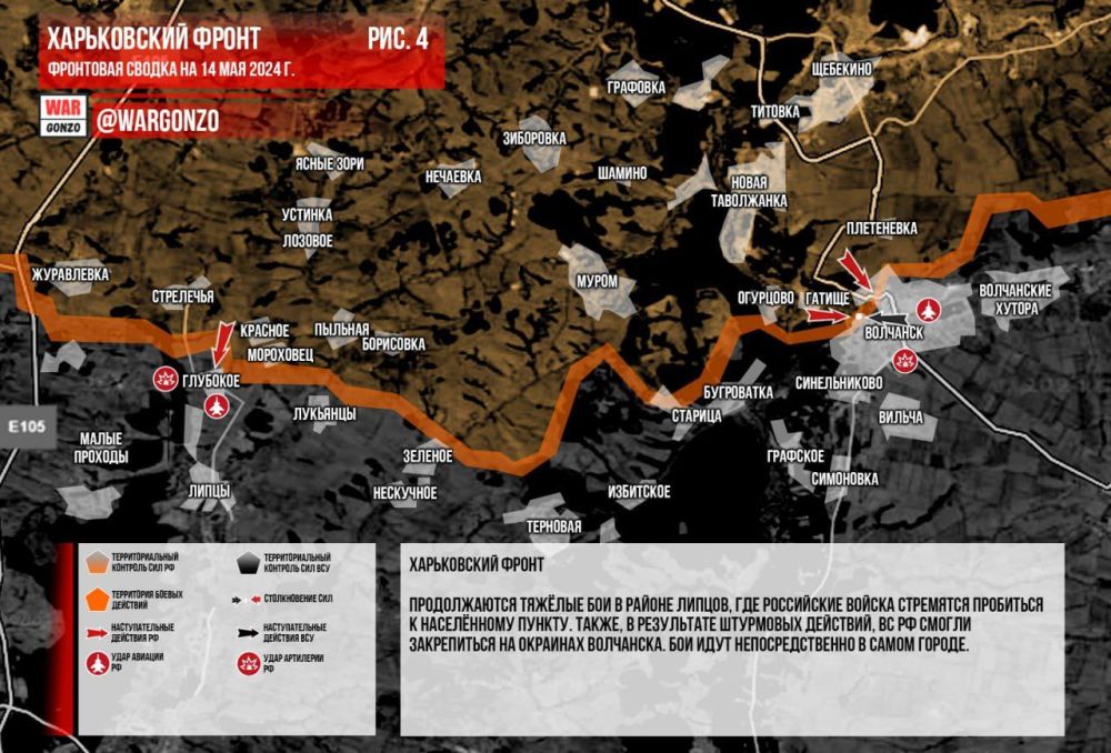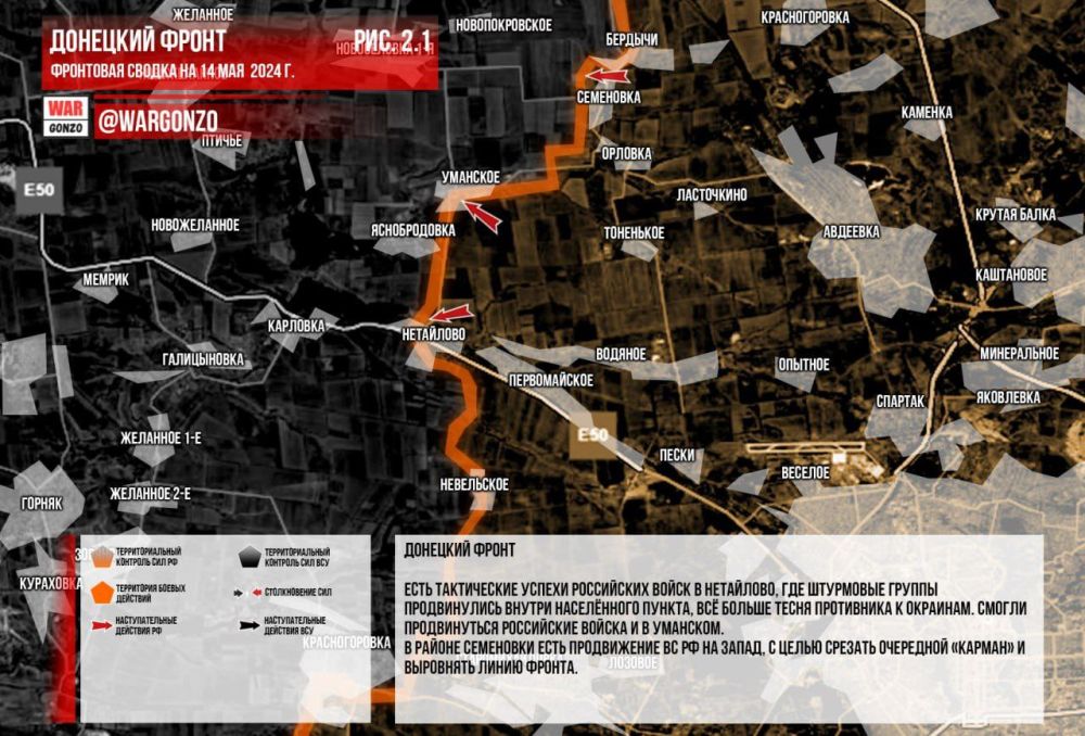 Фронтовая сводка на утро 14.05.2024 г. от Телеграм-канала WarGonzo.