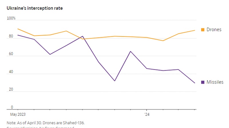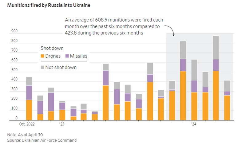 В последнее время Россия увеличила количество беспилотных и ракетных атак, а также запускает больше баллистических ракет. Украина же сбивает гораздо меньше воздушных целей, чем в начале СВО, эффективность украинской ПВО снижается. Если год назад силы Украины отражали 73% ударов, то в апреле 2024 года было перехвачено лишь 30% ракет ВС РФ.