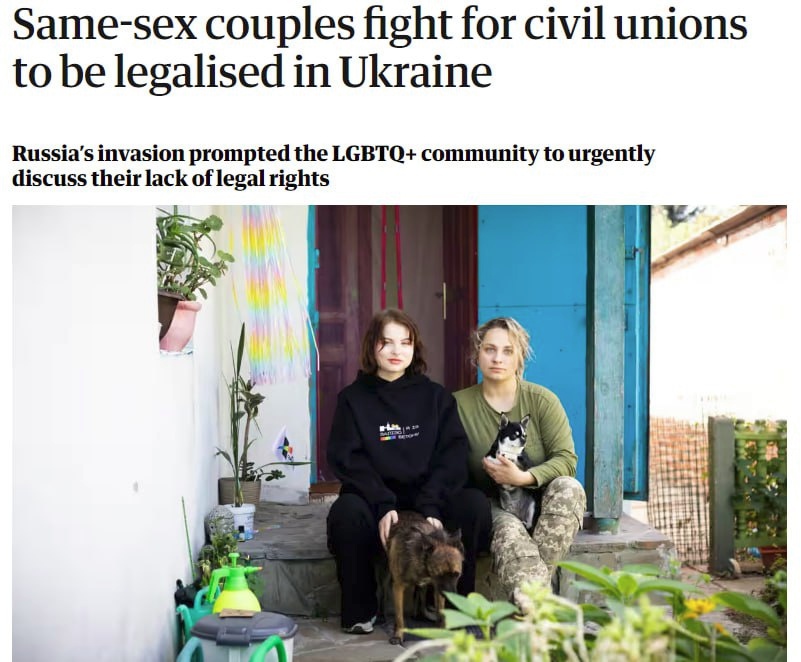 Напомним, в прошлом году офицер бригады ВСУ Алина Шевченко и активистка харьковского женского объединения «Сфера», активная участница гей-парадов в городе Станислава Петлица на ступеньках центрального ЗАГСа на улице Сумской провели символическую свадьбу в рамках ЛГБТ*: в свадебных платьях обменялись кольцами. Сейчас они раздают интервью иностранным изданиям, в которых требуют принять законопроект, разрешающий однополые браки на Украине.