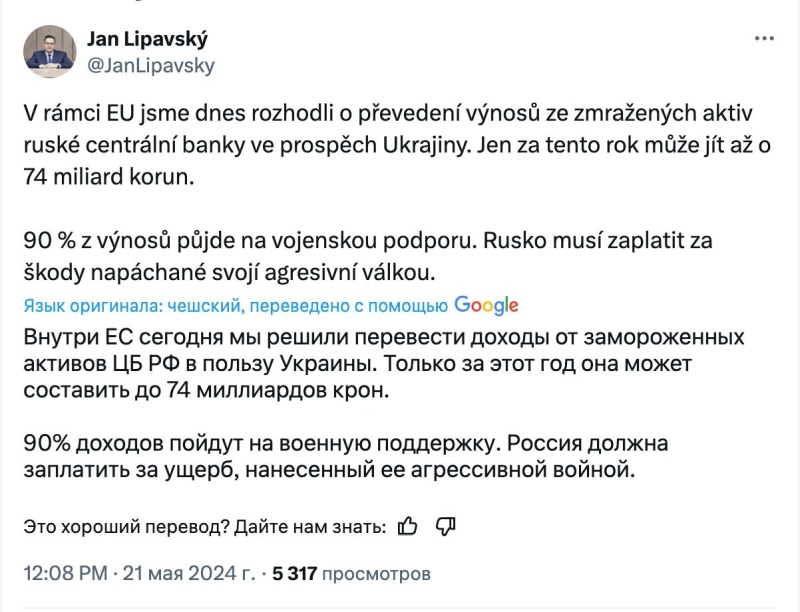 «Совет ЕС утвердил соглашение об использовании доходов от иммобилизованных активов ЦБ РФ в пользу Украины. Ожидается, что годовой доход составит от 2,5 до 3 миллиардов евро. 90% ожидаемых доходов будут использованы в военных целях для поддержки обороны Украины», — написал глава МИД Чехии Ян Липавский в соцсетях.