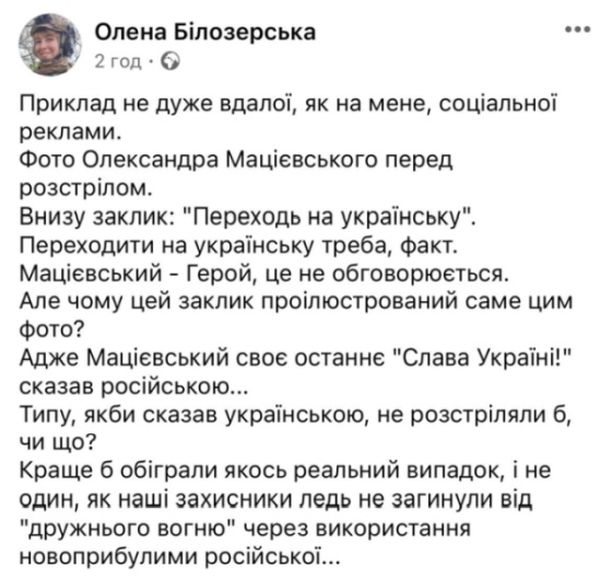 «Переходить на украинский надо, факт. Мациевский — Герой, это не обсуждается. Но почему этот призыв проиллюстрирован именно этим фото? Ведь Мациевский свое последнее «Слава Украине!» сказал на русском... Типа, если бы сказал на украинском, не расстреляли бы, что ли?» — написала Белозерская в соцсетях.