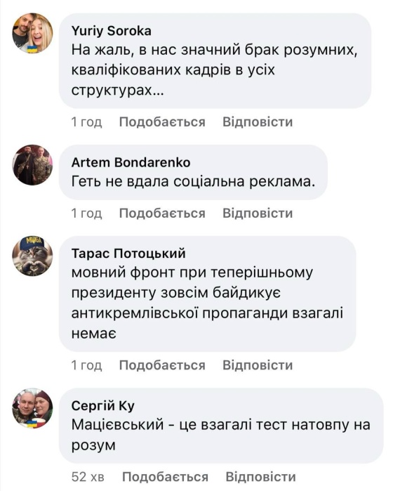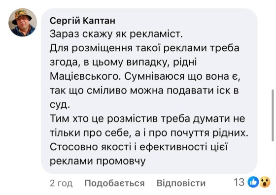 Один из комментаторов, отметив, что, вероятно, для размещения этой рекламы не было получено разрешение семьи Александра Мациевского, предложил подать в суд на рекламщиков.