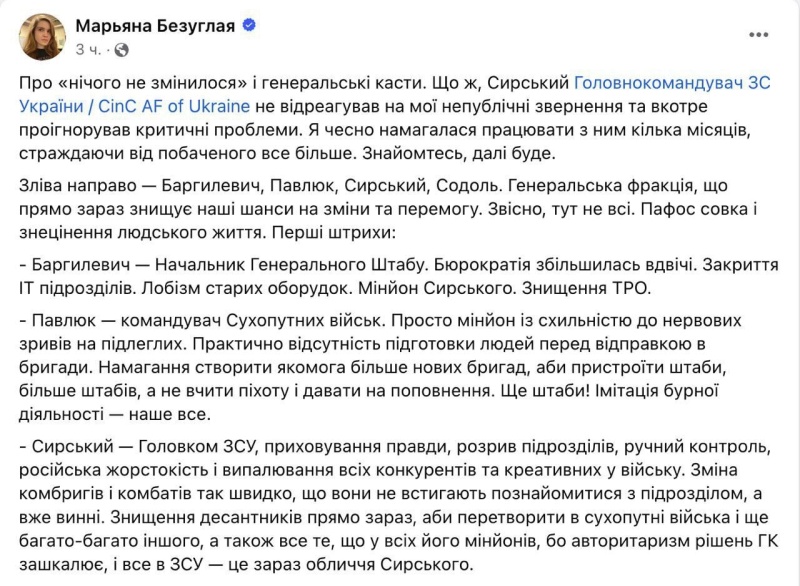 «Баргилевич — начальник Генерального Штаба. Бюрократия увеличилась вдвое. Закрытие ИТ-подразделений. Лоббизм старых сделок. Миньон Сырского. Уничтожение ТРО», — написала Безуглая.