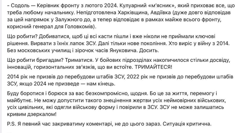 «Кулуарный "мясник", который скроет все, что надо любому начальнику. Неподготовленная Харьковщина, Авдеевка (очень долго отвечал за это направление у Залужного, а теперь отвечает в рамках почти всего фронта, полезный генерал для Главкомов)», — расширила нардеп характеристику Содоли.