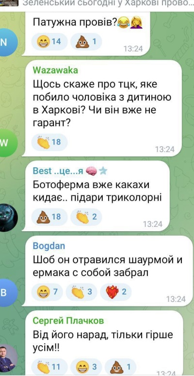 «Не все так однозначно с типографией, в которую вчера прилетело. Во-первых,самое очевидное: куча фоточек и видосиков, хотя на Украине существует запрет на выкладывание каких бы то ни было последствий. Во-вторых, чего там вдруг оказался Синегубов? Ну, Терехов ладно, просто мелкий дурачок, который старается не пропадать из поля зрения. А тут вдруг целый губернатор. И уб****к Зеленский, который стонет о том, что сгорело 50 000 книг (хотя это вообще не объем для типографии такого уровня, сутки работы на расслабоне, хоть она и не самая большая в Европе, как вдруг ни с того, ни с сего, руководство так назвало среднюю по размерам контору), но не вспоминает о 7 погибших и несет дичь про ПВО, которая нужна Харькову. Пусть бы лучше рассказал, как с его подачи ПВО расставляют в жилой застройке и она убивает жителей Украины в гораздо больших объемах, чем точные русские ракеты причинили случайных жертв. Точно так же харьковские помойные телеграм-каналы стонут и льют слёзы над разбитыми окнами и поврежденными аттракционами в парке Горького, но не о людях. На людей всем плевать, если не сказать хуже. У рабов хотя бы была кормежка и подстилка для отдыха, а мы статусом еще ниже. Просто биомасса», — прокомментировал приезд Зеленского подписчик телеграм-канала «Первый Харьковский».