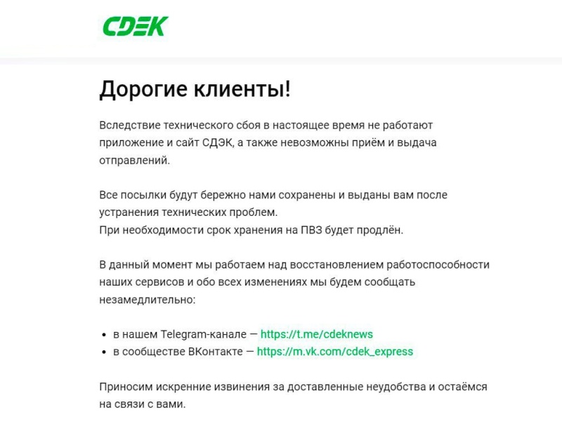 Директор по коммуникациям СДЭК Михаил Берггрен заявил, что на данный момент компания столкнулась с обширным техническим сбоем, последствия которого все еще устраняем. «За вчерашний день мы сильно продвинулись в восстановлении работоспособности наших систем, но этого оказалось недостаточно, чтобы возобновить обслуживание на ПВЗ. О причинах возникновения технического сбоя мы сможем говорить только после того, как восстановим обслуживание и проведем внутреннее разбирательство по данному вопросу. На данный момент я также хочу принести извинения всем нашим клиентам, чьи ожидания мы не оправдали в последние рабочие дни», — рассказал Берггрен.