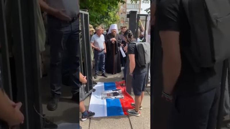 В Черкассах проходит судилище над митрополитом Черкасской епархии УПЦ Феодосием. Сегодня перед началом очередного заседания «патриоты» устроили «божий суд» в своей омерзительно-аморальной интерпретации. Они расстелили на земле перед входом в здание суда российский флаг с напечатанным портретом патриарха Кирилла. Топтать портрет митрополит Феодосий отказался и попросил убрать флаг.