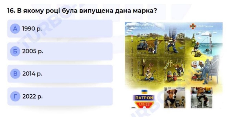 Выпускникам украинских школ на экзаменах предлагают определить год выпуска марки с псом Патроном