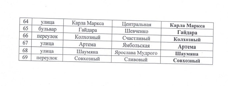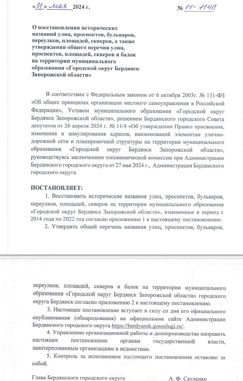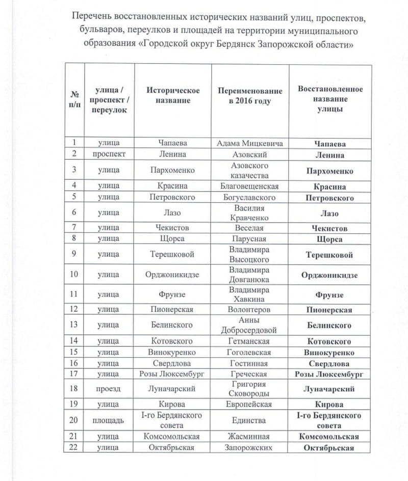 В рамках утвержденного городским советом порядка глава Бердянска Александр Сауленко подписал постановление №01-114П «О восстановлении исторических названий улиц, проспектов, бульваров, переулков, площадей, скверов, а также утверждении общего перечня улиц, проспектов, площадей, скверов и балок на территории муниципального образования «Городской округ Бердянск Запорожской области».