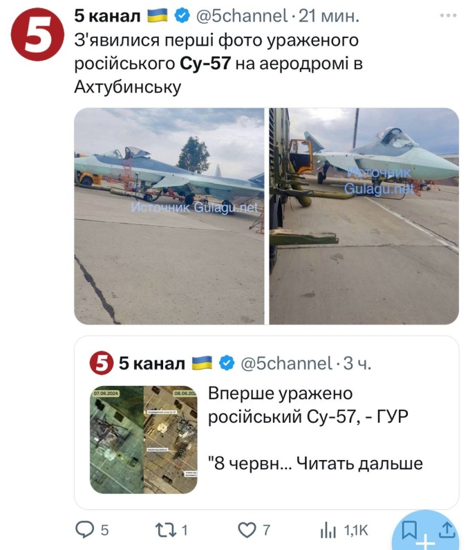«Вот только эти, опубликованные ресурсом gulаgu.nеt и подхваченные остальными, фотографии — стоковые, им более 10 лет. Изображён на них, строго говоря, не Су-57, а его прототип Т-50 с бортовым номером 058. Кстати, такие трёхзначные бортовые номера тоже являются отличительным признаком именно прототипов, а не серийных образцов. Выдаёт прототип и окраска, отличающаяся от более тёмного «пиксельного» камуфляжа серийных образцов. И главное: самолёт на фотографиях совершенно не похож на получивший какие-либо повреждения. Мы видим абсолютно целый истребитель, что уже противоречит россказням вражеских пропагандистов», — говорится в сообщении телеграм-канала «Война. Без фейков».