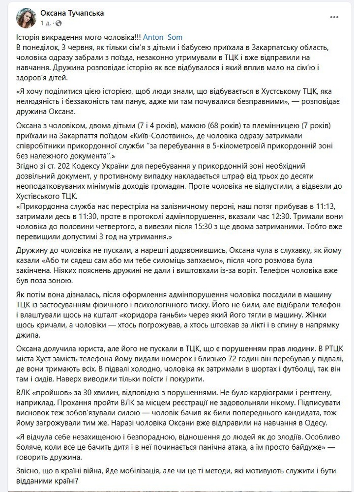 На Закарпатье прямо с вокзала мобилизовали 42-летнего мужчину, приехавшего из Киева в Солотвино на отдых с двумя маленькими дочками возрастом 7 и 4 года. Мужчину сразу задержали сотрудники пограничной службы «за пребывание в 5-километровой приграничной зоне без должного документа». Его насильно отправили в местный ТЦК, где он за 30 минут прошёл медкомиссию, без кардиограммы и рентгена. Просьбу пройти ВВК по месту регистрации ему не удовлетворили, а подписать заключение медкомиссии заставили угрозами. На глазах мужчины избивали предыдущего мобилизованного. Всех призывников держали в подвале и избивали, заставляя подписывать заключение медкомиссии.