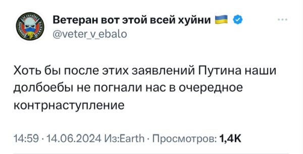 «Хоть бы после этих заявлений Путина наши д***бы не погнали нас в очередное контрнаступление», — пишет украинский телеграм-канала «Ветеран вот этой всей х***и».