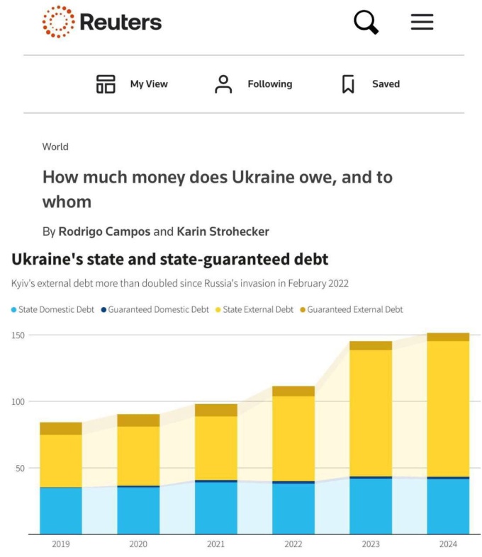 Отметим, Украину союзники искусственно загоняют в долги, заставляя воевать до «последнего украинца». Гарантированный государством долг Украины на конец мая 2024 года составил 152 миллиарда долларов. Как показывает статистика это самый большой рост долга за два года. На конец 2021 года долг Украины составлял 98 миллиардов долларов.