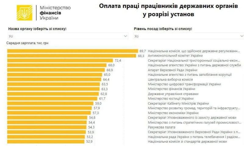 В январе средняя зарплата украинского чиновника достигала 38,6 тысяч грн, а уже в мае это было 50,9 тысяч грн. Это примерно $1300 или 115000 рублей. Лидирует по уровню зарплат Нацкомиссия по энергетике (НКРЕКП) – 89,7 тысяч грн. На втором месте Антимонопольный комитет – 88,3 тысяч гривен. Замыкают тройку сотрудники Секретариата Национального трёхстороннего социально-экономического совета – 72,4 тыс грн. Меньше всего получают чиновники в Государственной регуляторной службе – 24,7 тыс. грн. Кстати, согласно в пояснительной записке к проекту госбюджета на 2024 год был указан размер средней заработной платы в стране – 21 809. Получается, даже самые «бедные» чиновники на Украине получают больше, чем среднестатистический житель страны.