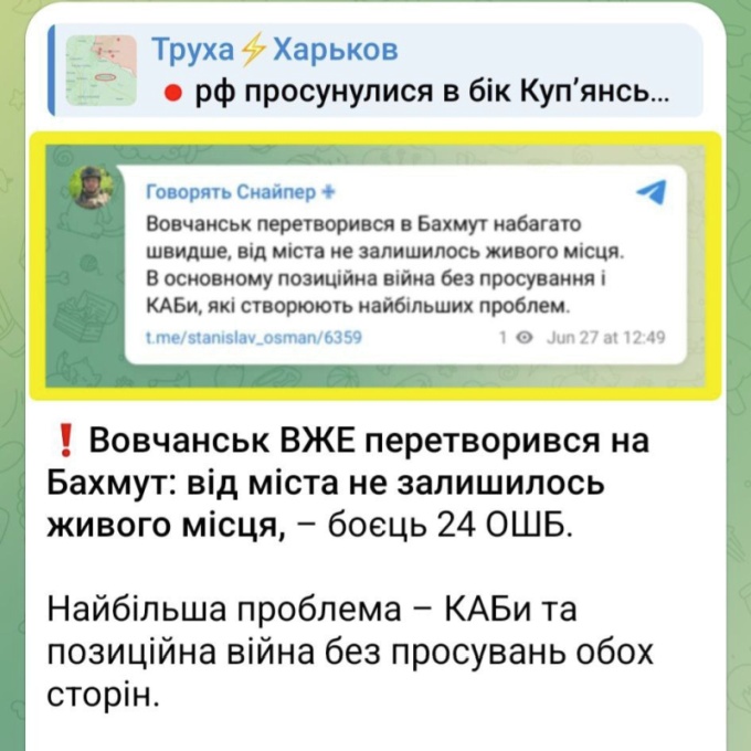 «Купянск. Враг оголяет силы, перебрасывая их в Волчанск. А мы у Купянска продвигаемся вперед. Золочев (правее Липцев) — мы идем вперёд разведчиками», — добавил Алёхин.