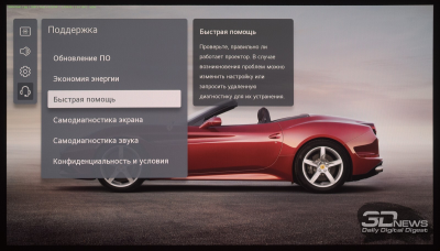 В последнем разделе, «Поддержка», представлены энергосберегающие функции, тесты самодиагностики вывода картинки и звука, электронная справка (инструкция по использованию проектора). Через данный раздел можно провести обновление системы (прошивки) и почитать условия соглашения о конфиденциальности.
