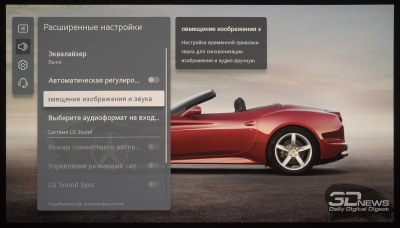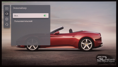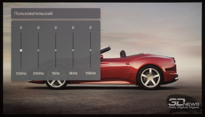 В разделе «Звук» присутствует вполне стандартный набор режимов эквалайзера. Здесь же можно настроить частоты вручную и произвести более глубокие регулировки вывода звука. Доступен широкий выбор аудиовыходов, система автоматической регулировки уровня громкости (для выравнивания громкости при переключении источников) и настройки синхронизации звука и видео, если возникают соответствующие проблемы.