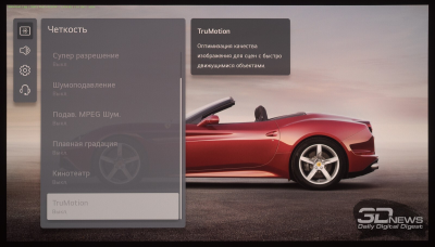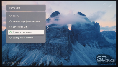 Для ценителей повышенной плавности при просмотре различного видеоконтента предусмотрена известная по многим телевизорам технология TruMotion (она же MEMC — Motion Estimation and Motion Compensation), оценивающая движение в кадре и добавляющая промежуточные кадры, в результате чего изображение становится более плавным и чётким. Для игр система не очень подходит, а вот для фильмов и сериалов, снятых с частотой 24-30 кадров в секунду, – в самый раз.