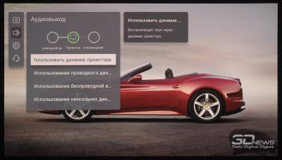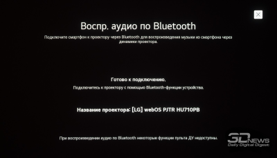 Компания LG отмечает, что проектор LG CineBeam Q HU710PB следует использовать с внешними акустическими системами по беспроводному каналу подключению (Bluetooth). Поддерживаются все необходимые стандарты, а поэтому улучшить качество звука при необходимости не составит никакого труда.
