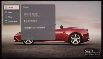 Первым перед нами открывается раздел под названием «Экран». В нём можно выбрать один из многих предустановленных режимов изображения, изменить формат картинки (режим работы скалера), настроить огромное количество функций, отвечающих за качество изображения.