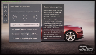 Интерфейс системы хорошо знаком поклонникам бренда, работает система достаточно быстро и плавно и — что не менее важно – стабильно. ОС содержит встроенный браузер с поддержкой вкладок и универсальный мультимедийный плеер, а также обеспечивает возможность подключения к FTP-серверам и NAS-хранилищам. Для большего удобства работы с проектором к нему можно подсоединить беспроводные устройства ввода — мышку и клавиатуру. Это будет ещё более удобным средством управления, ведь у комплектного пульта отсутствует так полюбившаяся поклонникам LG технология «аэромыши».