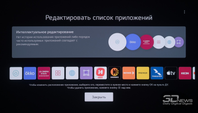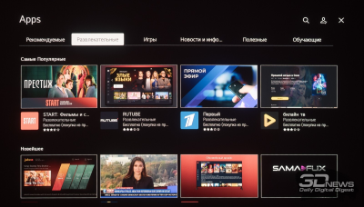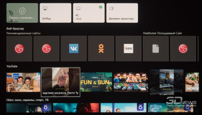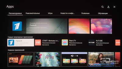 Сама же оболочка работает комфортно и не вызывает особых нареканий. Заглавная страница интерфейса WebOS выглядит современно и ярко. Она имеет традиционную плиточную структуру, с широкими эффектными баннерами, предложениями и рекламой, а также некоторой рабочей информацией. Есть отдельная полоса с установленными приложениями и переходом к магазину приложений. Доступна как ручная настройка расположения иконок программ, так и интеллектуальная сортировка на основании частоты использования ПО.