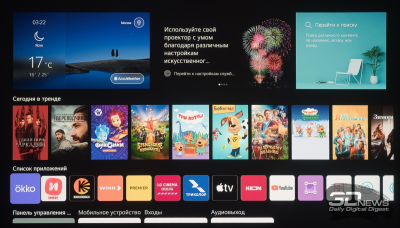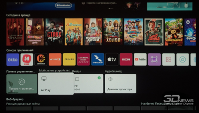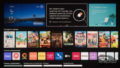 Новый проектор LG поставляется в локализованном виде, а потому большая часть предустановленных или предлагаемых сервисов полноценно работают на территории РФ и СНГ. При отсутствии необходимости в них вы можете использовать подключение к ПК и выводить с него любой другой контент. Также не возбраняется подключение любых USB-накопителей с закачанными на них видеофайлами с очень высоким битрейтом (но с ограничением до 4К 30 кадров в секунду и, увы, без HDR).
