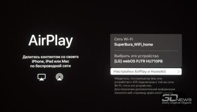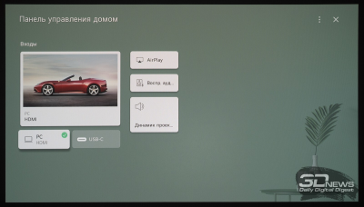 Есть панель быстрого доступа к различным подключенным устройствам, выбор источника звука и переход к отдельному экрану «Панель управления домом» для вывода всех возможностей подключения, в том числе умных устройств с поддержкой технологии LG ThinQ.
