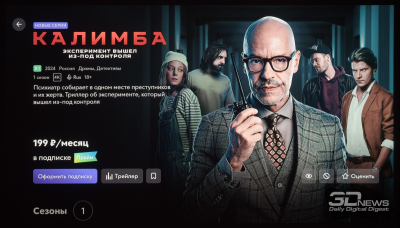 На пульте ДУ представлено четыре кнопки быстрого перехода к онлайн-кинотеатрам (ИВИ, Оkko, «Кинопоиск», Netflix), качелька регулировки громкости, кнопка Mute, клавиши для навигации, кнопки для выхода на домашний экран и перехода к разделу с основными настройками. Подсветка клавиш отсутствует, а их ход достаточно мягкий, без какого-либо звука нажатия.