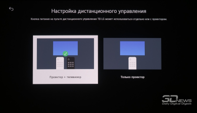 На корпусе проектора, как было отмечено раньше, есть только одна кнопка, отвечающая за включение и выключение устройства. Основным же элементом управления является пульт ДУ, работающий исключительно по ИК. На фоне ранее протестированных проекторов от LG, безусловно, мы рассматриваем эту особенность как недостаток. Для работы пульта его необходимо направлять в сторону проектора, а для максимально стабильной работы направлять именно в область с ИК-приёмником, находящимся в задней части устройства.