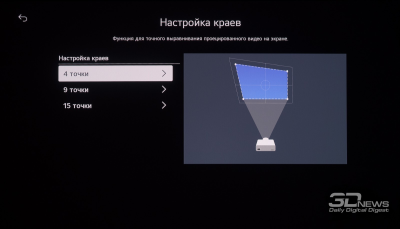 Последнее нарекание относится к корректности работы системы автоматической коррекции трапецеидальных искажений и фокусировки. Безусловно, компания LG сразу указывает на ограничения работы технологии и не обещает 100%-й точности, но все же нельзя не упомянуть, что в нашем тестировании система проявила себя не лучшим образом, а ее выключение не всегда приводило к сбросу внесенных коррекций изображения, что в последующем создавало различные сложности. Надеемся, что данная особенность работы будет исправлена в будущих программных обновлениях проектора.