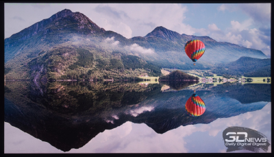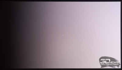 Но качество картинки от этого никак не страдает. Изображение отличается высокой чёткостью и детализацией, особенно при выводе оригинального 4К-контента. Нет проблем с градиентами, а равномерность яркости по полю находится на хорошем уровне. То же самое можно сказать и про чёрное поле, где мы увидели классическое высветление в нижней зоне по центру, но больше заметное на фотоснимках, чем визуально. Для глаз потребителя с равномерностью чёрной заливки у проектора LG всё прекрасно. Зато несколько страдает резкость по краям экрана даже после точной ручной настройки фокуса, что в целом можно отнести к норме для столь компактных проекторов с относительно простой оптической схемой.