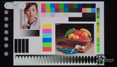 При заводских настройках проектора цветовой баланс изображения существенно смещён к холодным тонам, а стабильность ЦТ оттенков серого находится на высоком уровне. Точка белого оказалась близка к 12800 К – «холодно, очень холодно», а гамма-кривые идеально соответствуют референсной кривой со значением 2,2. Статичный коэффициент контрастности составил 1800:1. Глубокие тёмные и светлые полутона хорошо различимы – претензий нет. Яркость в данном случае составила 72 нита (расстояние до экрана порядка 2,4 метра, проекция — 80-85 дюймов), что примерно в три раза меньше, чем у ранее протестированного лазерного RGB-проектора с заявленными 1600 ANSI-лм (против 500 ANSI-лм у LG). Так что здесь никаких откровений – всё честно.