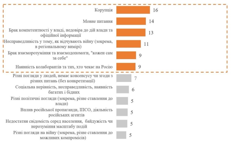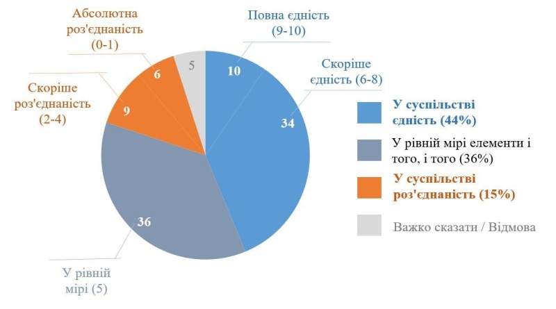Данные опроса Киевским международным институтом социологии (КМИС) свидетельствуют, что большинство опрошенных (44%) считают, что общество едино. Но 15% прямо заявили, что общество расколото. А 36%, что есть признаки и раскола, и единства.