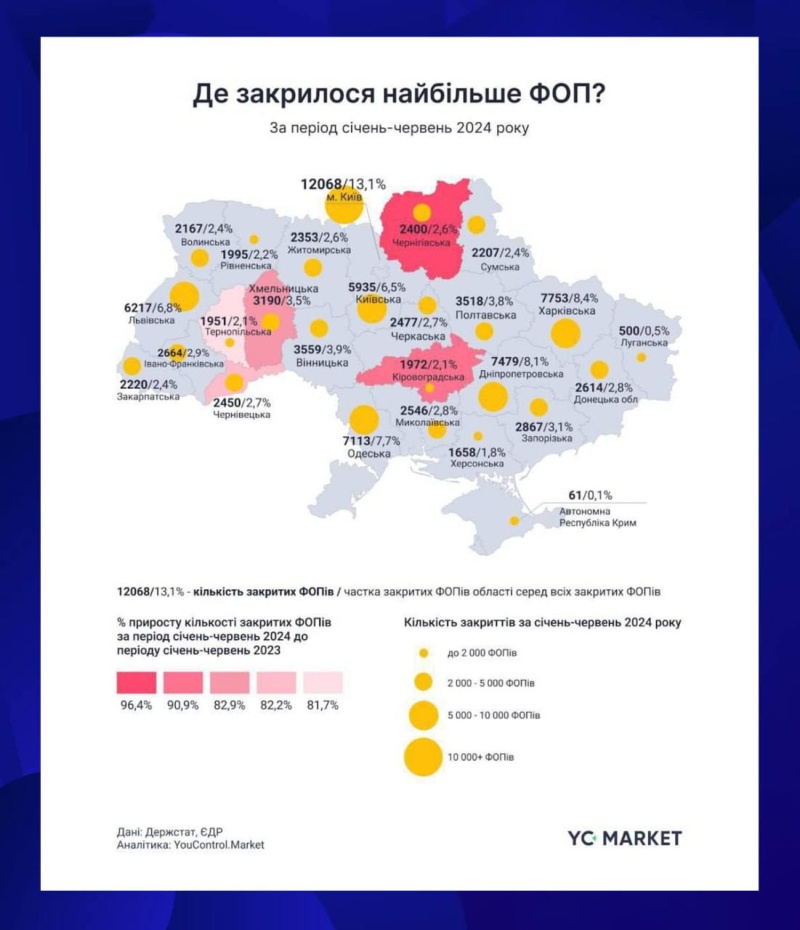 За первое полугодие текущего года на Украине закрылись почти 92 тысячи частных предпринимателей, что на 54% больше, чем за аналогичный период прошлого года. Такую статистику приводит YouControl.Market, основываясь на данных украинского Госстата.
